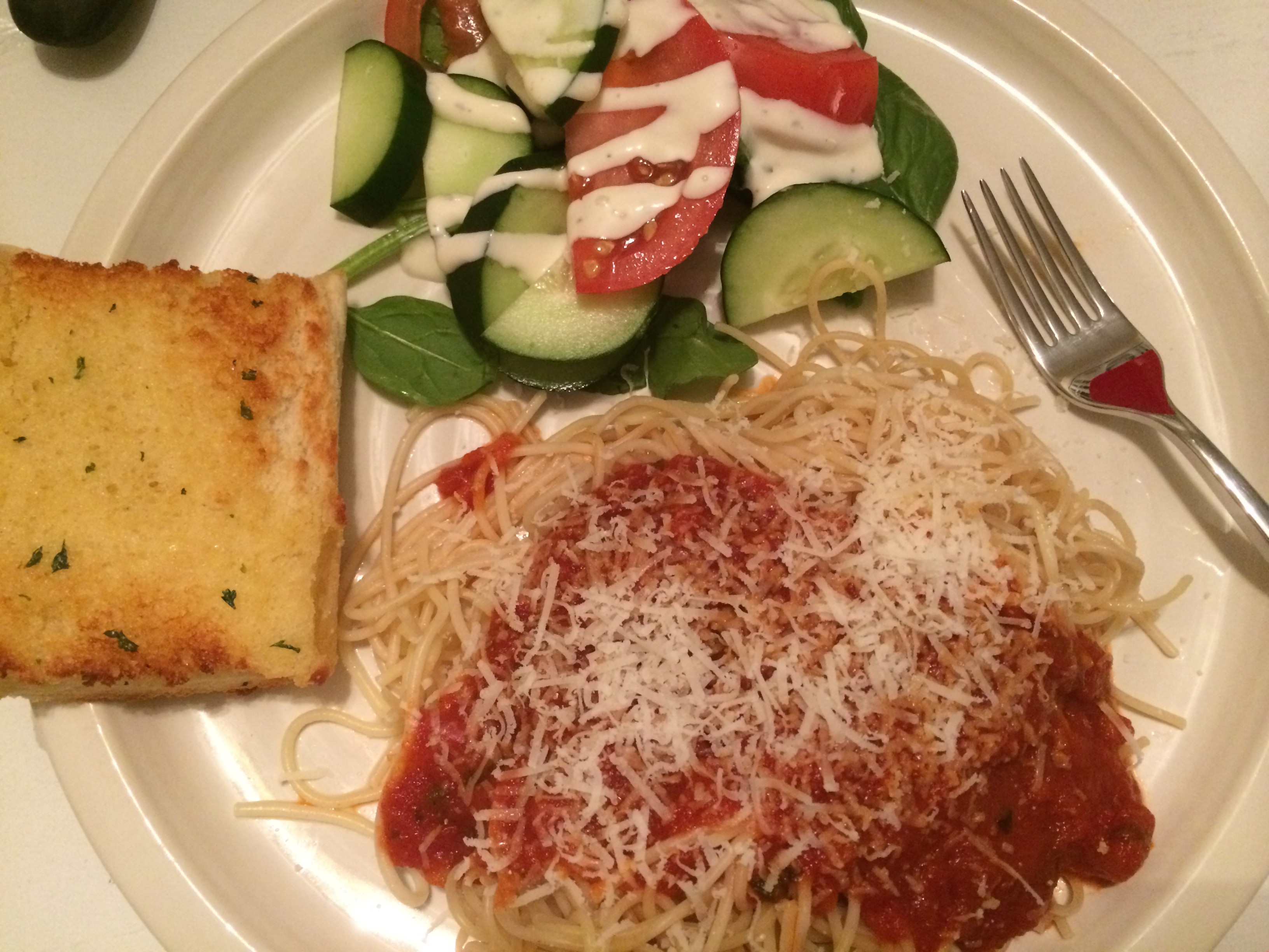 For breakfast I had some old fashioned oats cooked with a little Nutella. For lunch I had a mint chocolate Luna Bar while I was doing our grocery shopping followed by an apple with PB. For dinner I had leftover spaghetti, a piece of garlic bread and a side salad. Snacks included some hummus with thin pretzels and a cheese stick. As always plenty of water. On a typical day I do not drink anything aside from water. I don’t even drink coffee.